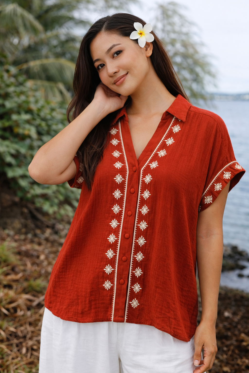 Ses délicates broderies florales blanches apportent une touche bohème chic, tandis que sa coupe ample assure un confort absolu au quotidien. Le col en V et les boutons recouverts soulignent subtilement le buste pour une allure féminine et décontractée.