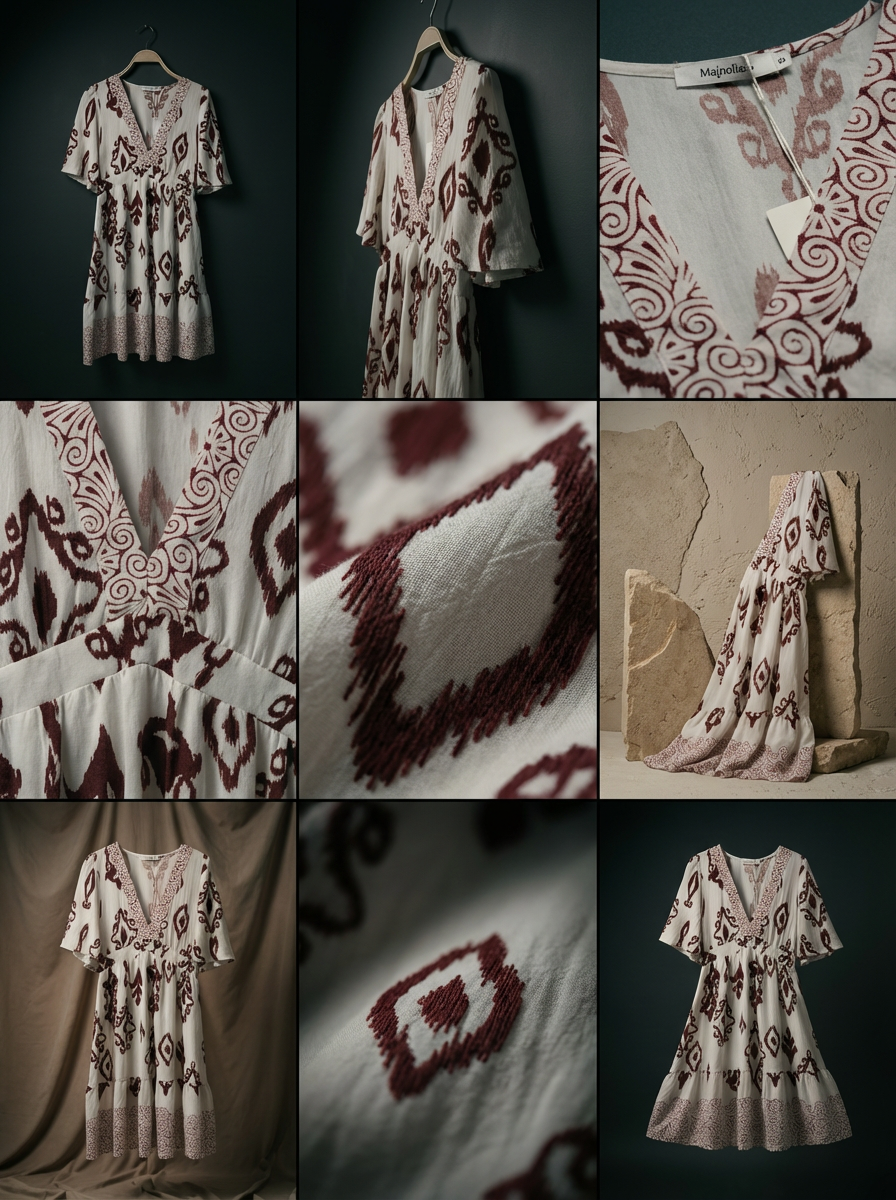Laisse-toi séduire par le charme authentique de notre robe courte Marron. Cette pièce unique se distingue par son jeu de contrastes : un motif Ikat audacieux sur l’ensemble du corps, sublimé par des bordures d’arabesques et de volutes délicates au niveau du décolleté et de l’ourlet.